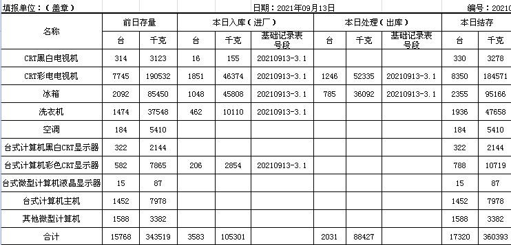 2021.09.13回收拆解統(tǒng)計表