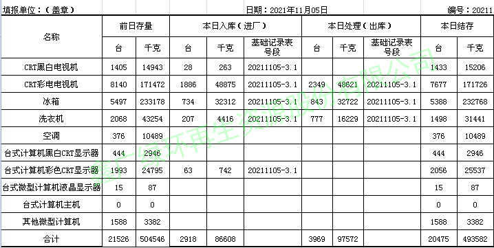 2021.11.05回收拆解統(tǒng)計(jì)表
