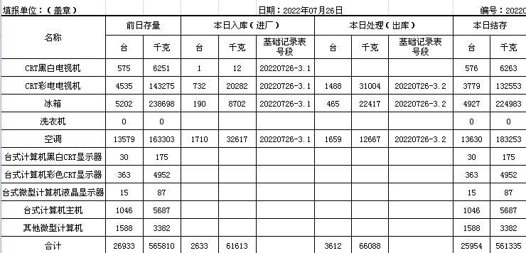 2022.07.26回收拆解統(tǒng)計(jì)表