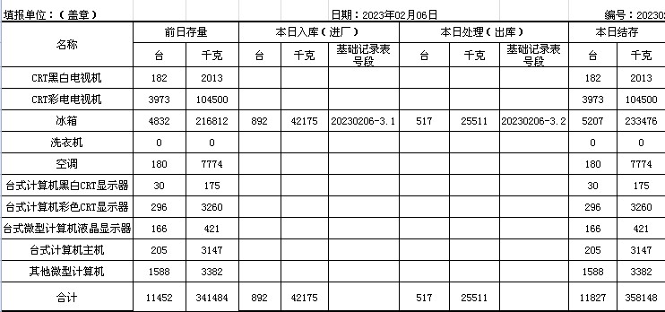 2023.02.06回收拆解統(tǒng)計(jì)表