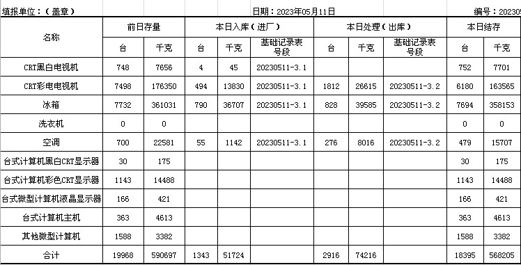 2023.05.11回收拆解統(tǒng)計(jì)表
