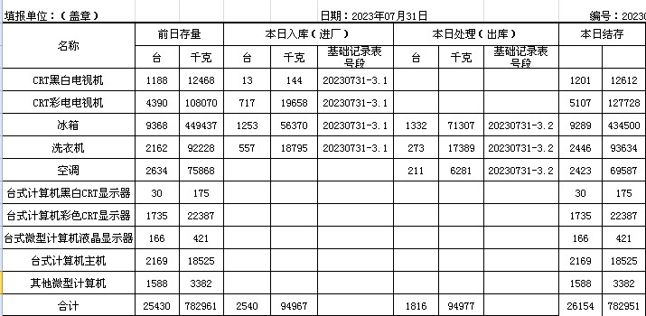2023.07.31回收拆解統(tǒng)計表