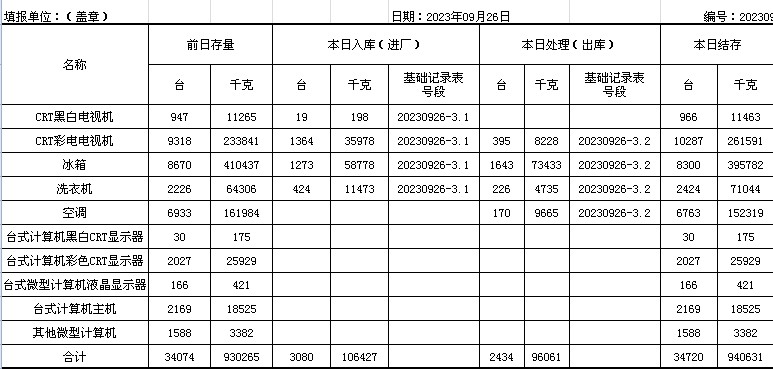 2023.09.26回收拆解統(tǒng)計表