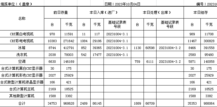 2023.10.04回收拆解統(tǒng)計(jì)表