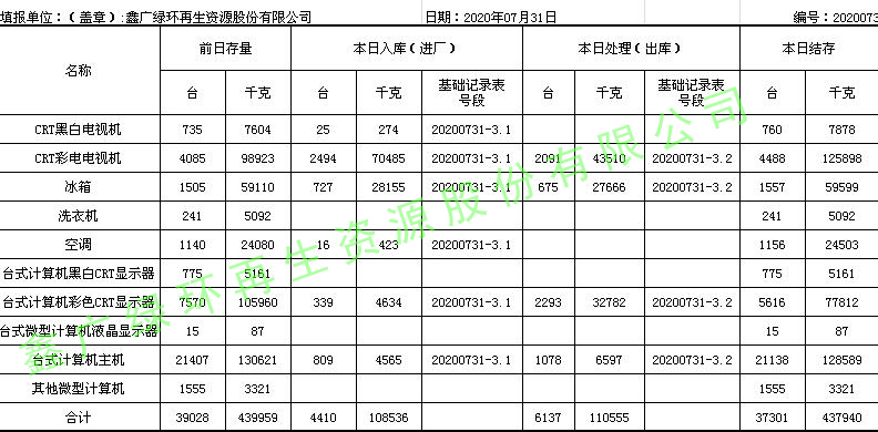 2020.07.31回收拆解統(tǒng)計(jì)表