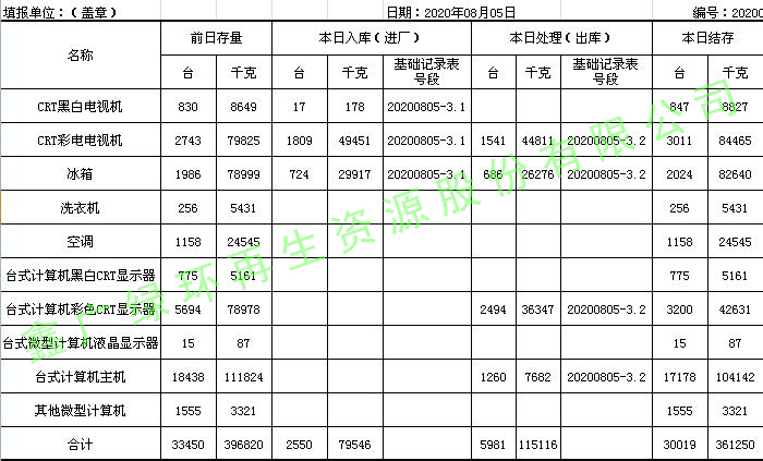 2020.08.05回收拆解統(tǒng)計(jì)表