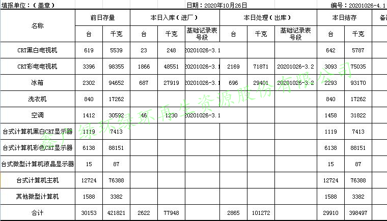 2020.10.26回收拆解統(tǒng)計(jì)表