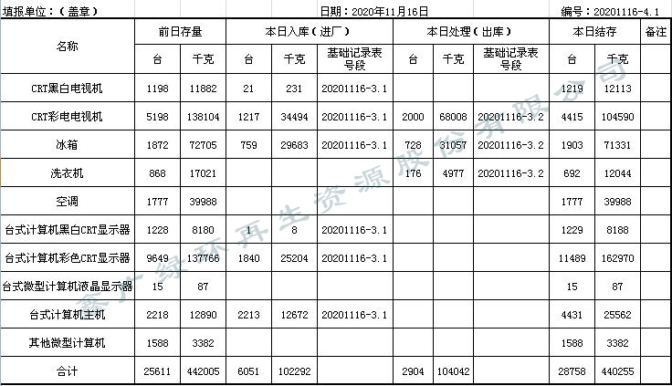 2020.11.6回收拆解統(tǒng)計(jì)表