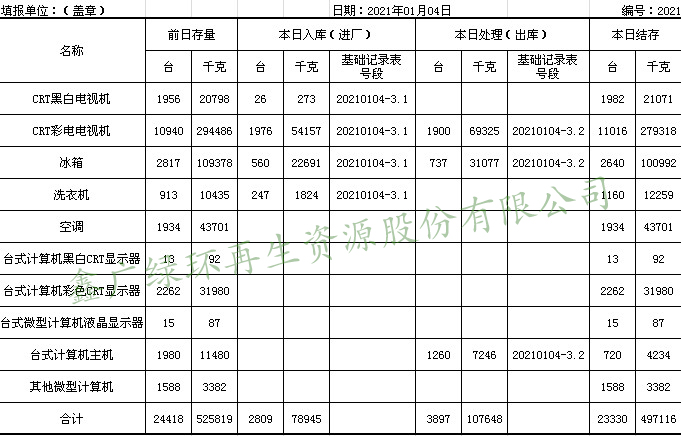 2021.01.04回收拆解統(tǒng)計(jì)表