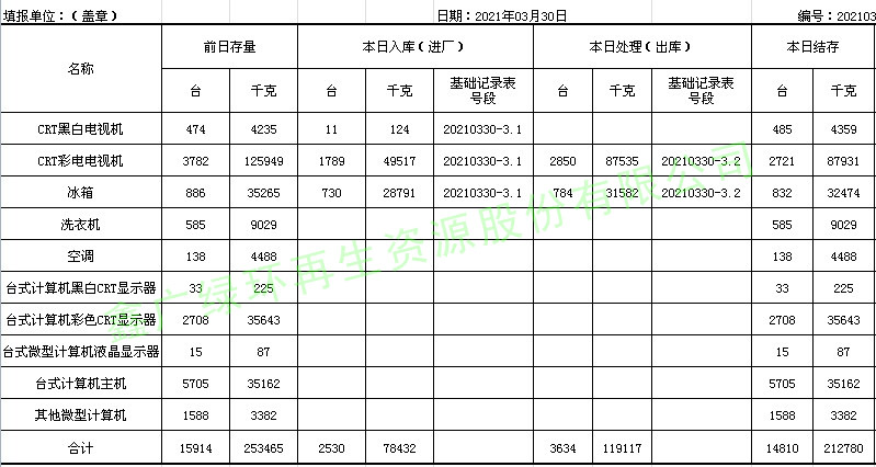 2021.03.30回收拆解統(tǒng)計(jì)表