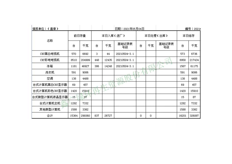 2021.05.04回收拆解統(tǒng)計(jì)表