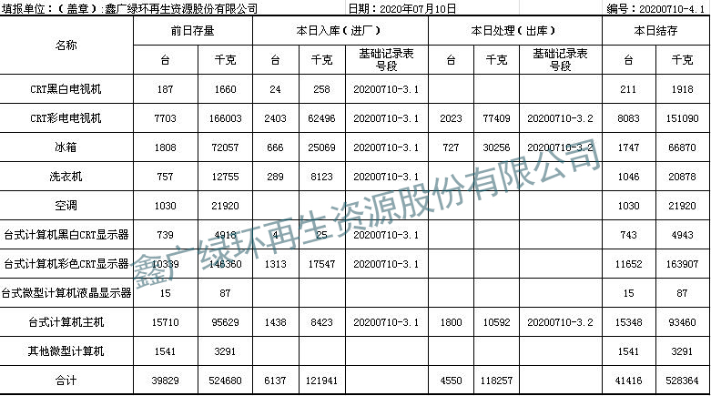 2020.07.10回收拆解統(tǒng)計(jì)表