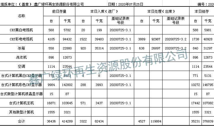 2020.07.25回收拆解統(tǒng)計(jì)表