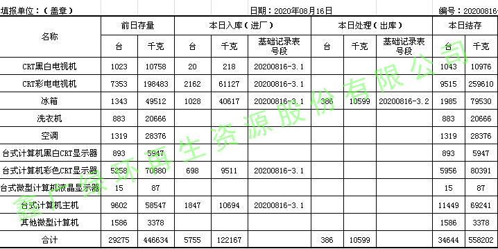 2020.08.16回收拆解統(tǒng)計(jì)表